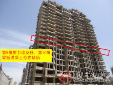 本項(xiàng)目位于內(nèi)蒙古鄂爾多斯市,為地下1層,地上22層的混凝土剪力墻結(jié)構(gòu),單層建筑面積877㎡,工程已完工封頂。根據(jù)設(shè)計(jì)要求,該樓9層剪力墻的混凝土強(qiáng)度等級(jí)為C25。經(jīng)國家建筑工程質(zhì)量監(jiān)督檢驗(yàn)中心對(duì)該樓9層剪力墻混凝土強(qiáng)度進(jìn)行檢測,發(fā)現(xiàn)該9層剪力墻、柱及10層梁板混凝土強(qiáng)度范圍為12.8MPa~15.3MPa,局部低至7.5MPa,不滿足設(shè)計(jì)C25混凝土的強(qiáng)度等級(jí)要求。本項(xiàng)目的置換處理時(shí)間為2012年4月~2012年11月。