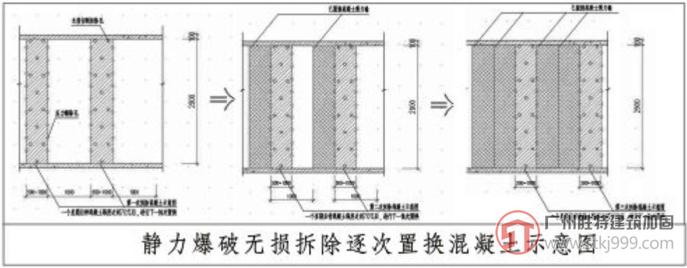 2、對(duì)置換原砼采用分步靜力拆除,減少對(duì)未拆除部分的影響,通過應(yīng)力解除孔和靜力拆除孔內(nèi)放置膨脹劑來實(shí)現(xiàn)。砼強(qiáng)度低,孔間距為300*300mm。