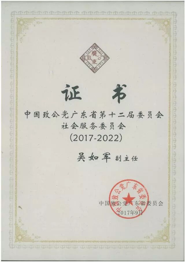 今年九月,我司董事長吳如軍先生被中國致公黨廣東省委員會聘為“中國致公黨廣東省第十二屆委員會社會服務(wù)委員會副主任委員”。將為我司提供更大的平臺參與更多的社會公益慈善服務(wù)。
