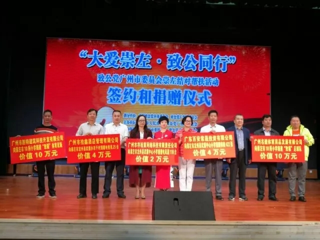 2017年10月20日,“大愛崇左·致公同行”結(jié)對幫扶活動簽約和捐贈儀式在廣西民族師范學(xué)院舉行。致公黨廣州市委會與崇左市相關(guān)領(lǐng)導(dǎo)舉行幫扶活動項目簽約捐贈儀式,計劃三年內(nèi)捐贈款物約68萬元,主要涉及一批幼師教育培訓(xùn)、電商培訓(xùn)、電子閱覽室建設(shè)等幫扶項目。